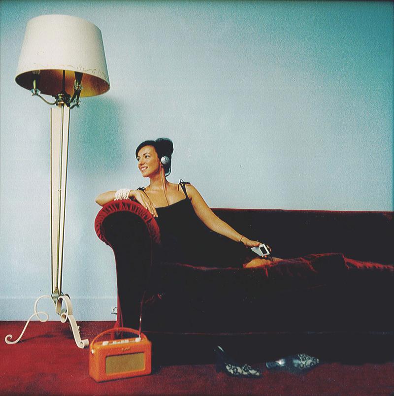 Couleur. Casque de DJ sur les oreilles, assise et accoudée sur le canapé rouge de l'appartement du 214.