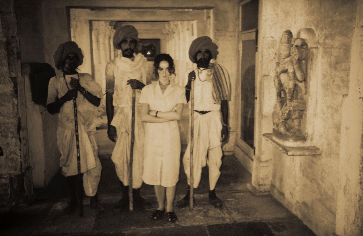 Sépia. Devant trois indiens, en robe blanche, les bras croisés.