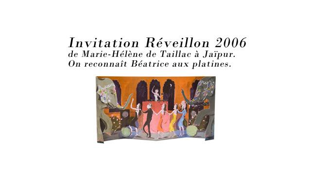 Invitation pour la soirée Réveillon 2006 de Marie-Hélène de Taillac à  Jaïpur. On reconnait Béatrice aux platines.