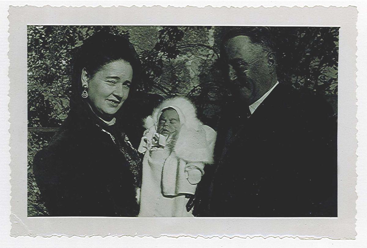 Noir et blanc. Bébé, dans les bras de ses grands-parents.