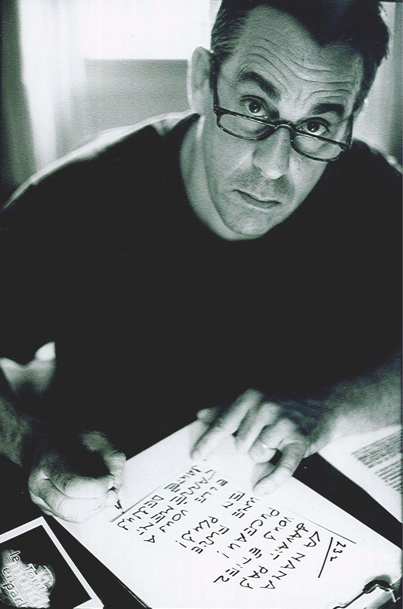 Noir et blanc. Dans son bureau, en train de préparer ses fiches.
