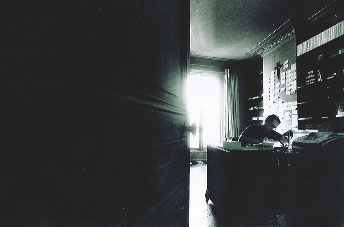 Noir et blanc. Depuis le couloir, dans son bureau, en train de préparer ses fiches.