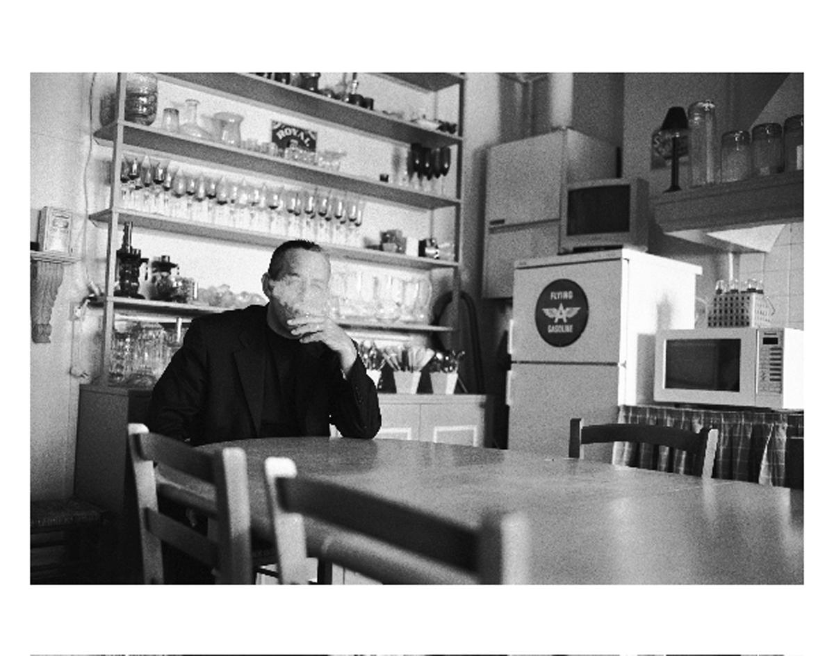 Noir et blanc. Derrière la fumée d'une cigarette, assis à  la table de la cuisine de l'appartement du 93.