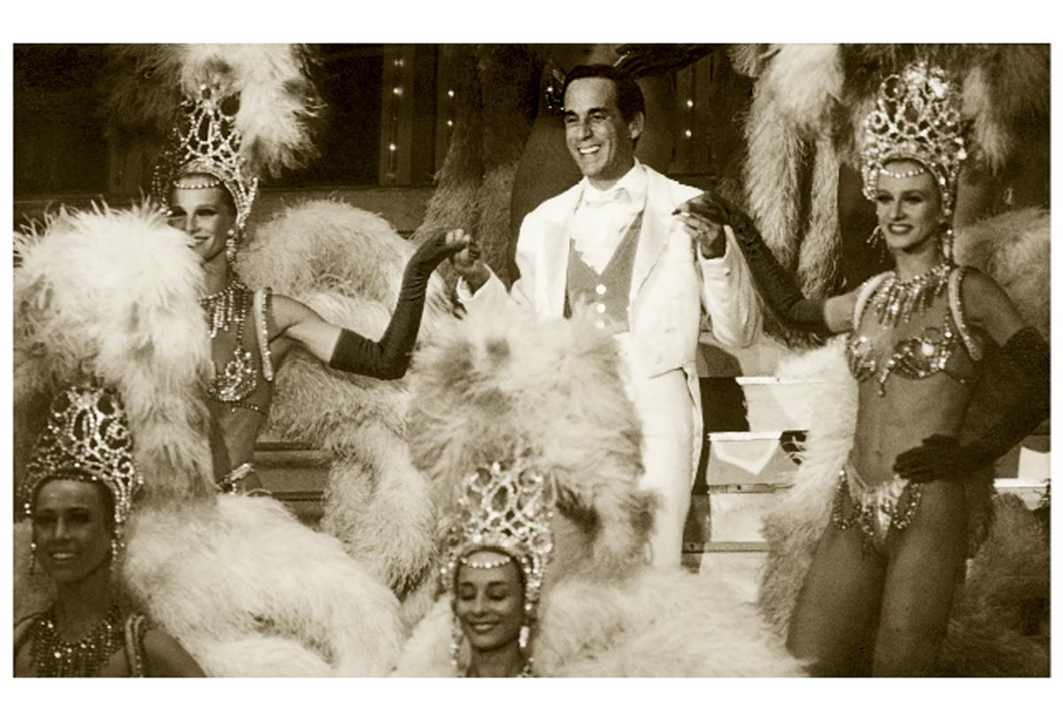 Sépia. Costume blanc au milieu des danseuses, pour l'émission Double jeu