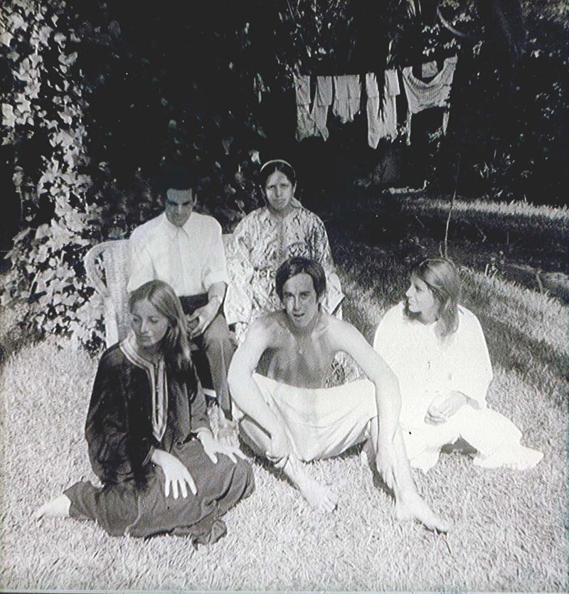 Noir et blanc. Période hippie, torse nu entouré de 4 personnes.
