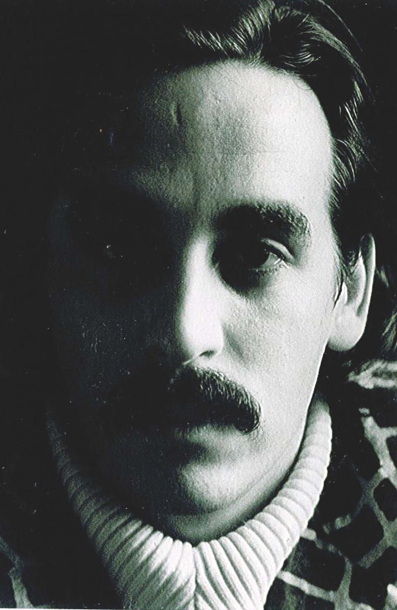 Noir et blanc. Période hippie, avec une moustache et un col roulé blanc.