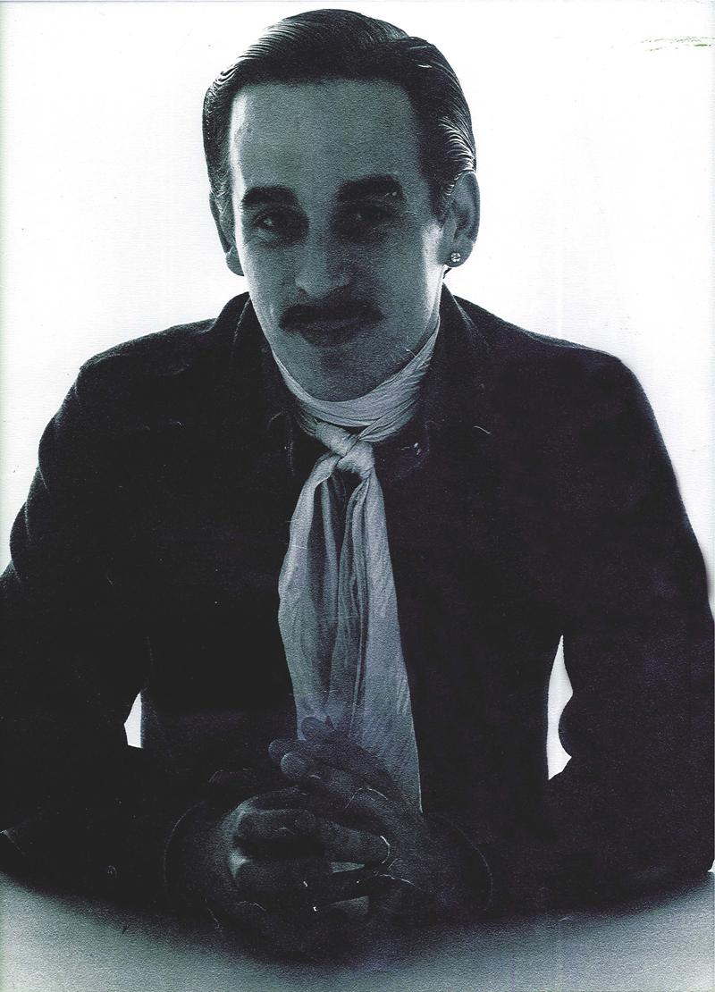 Noir et blanc. Période hippie, avec une moustache, une boucle d'oreille et un foulard.