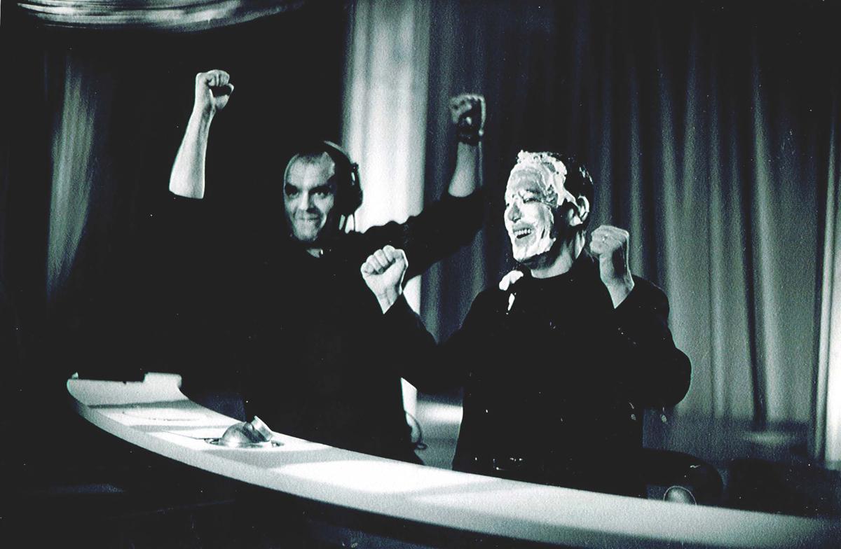Noir et blanc. Sur le plateau de l'émission Tout le Monde en Parle, entarté à  côté de Bouli.