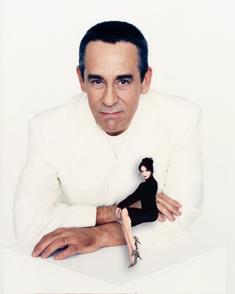 Couleur. Montage, Béatrice en robe noire, assise sur la main de thierry en costume blanc.