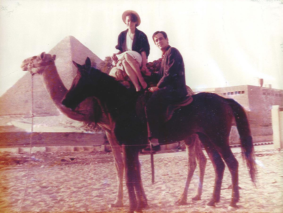 Couleur. Devant les pyramides en Egypte, Thierry sur un cheval, Béatrice sur un dromadaire.