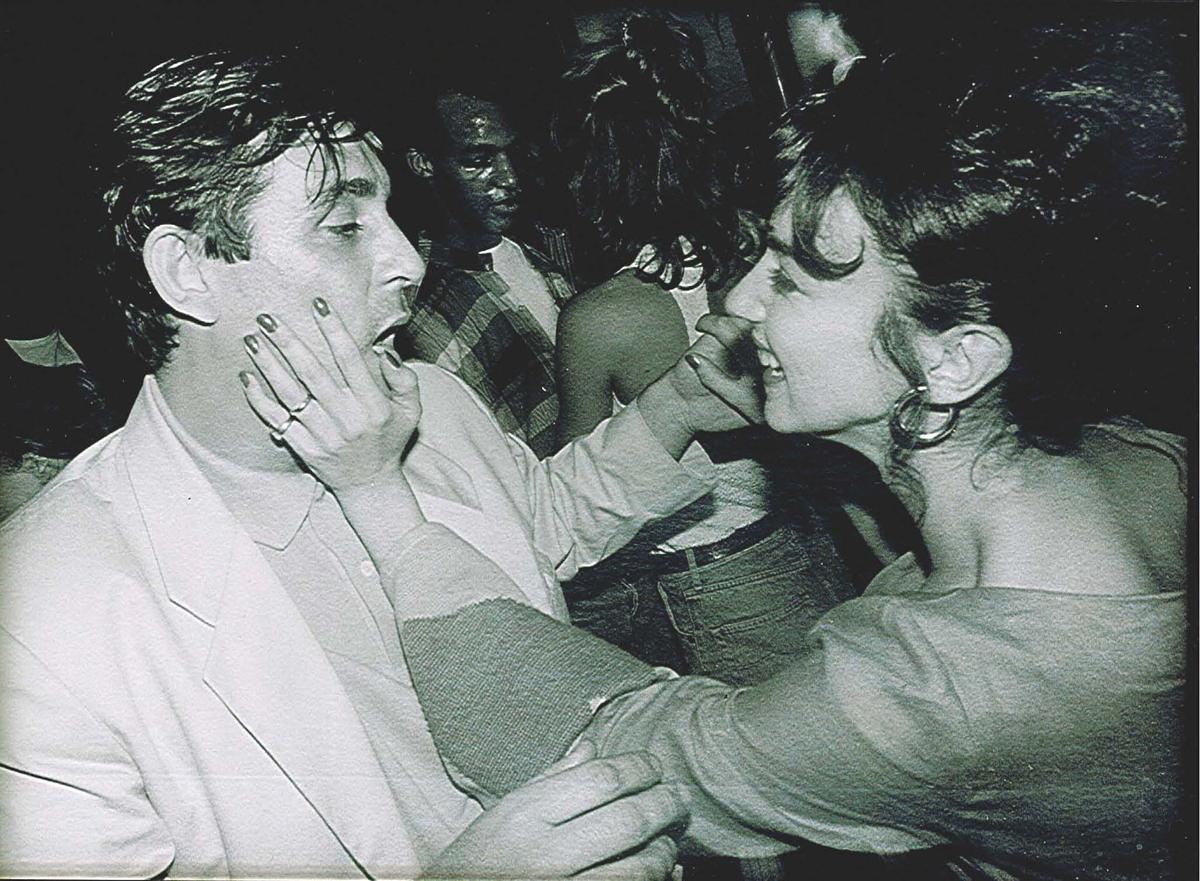 Noir et blanc. Debout, se regardant en souriant, dans une soirée.