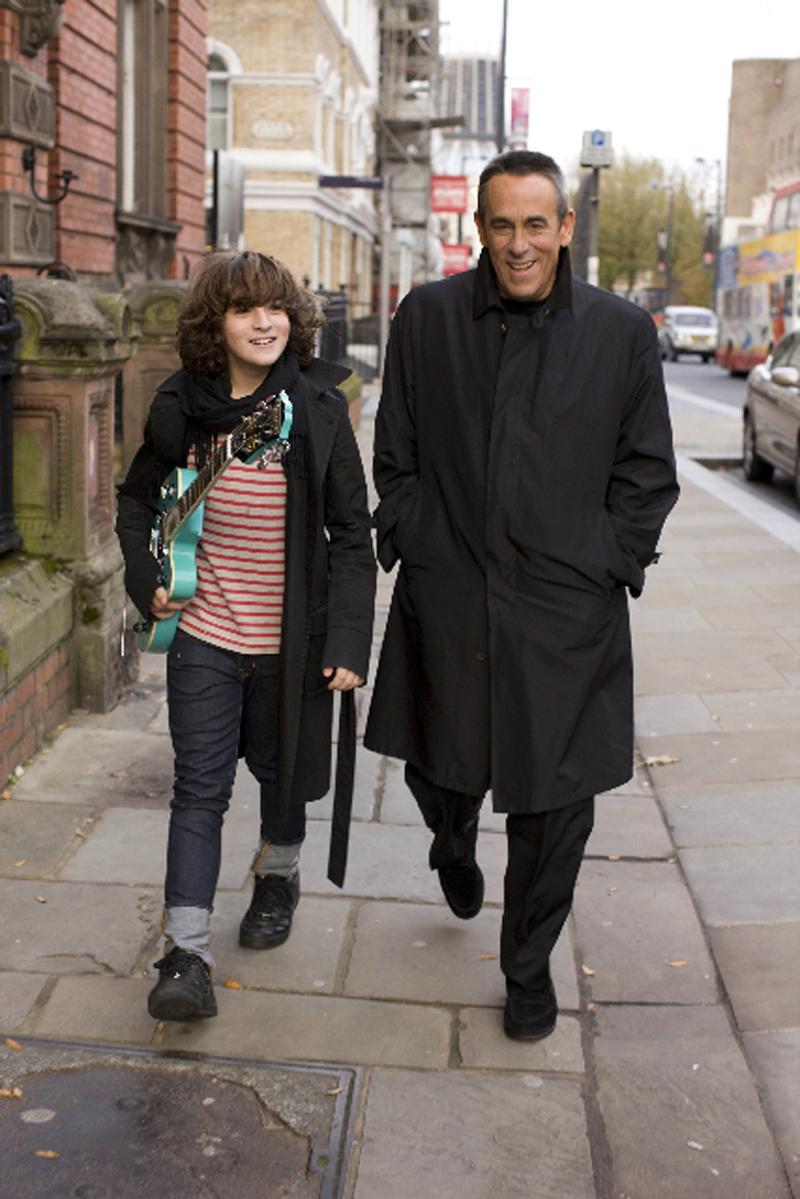Couleur. Marchant côte à  côte dans une rue de liverpool, Gaston avec une guitare bleue dans les bras.