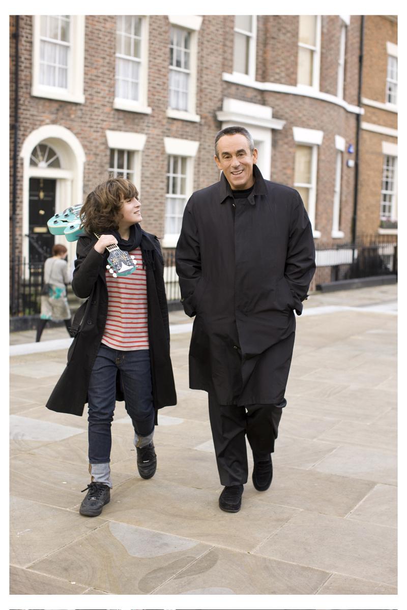 Couleur. Marchant côte à  côte dans une rue de liverpool, Gaston avec une guitare bleue dans les bras.
