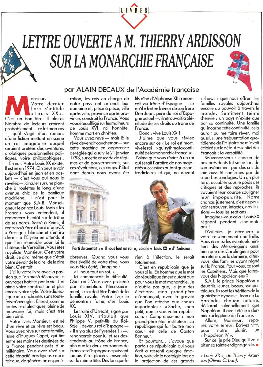 Lettre ouverte à  Monsieur Thierry Ardisson sur la Monarchie française, par Alain Decaux