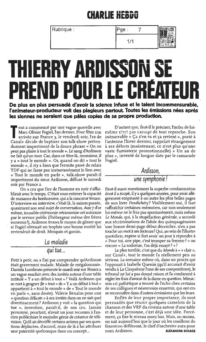 Thierry Ardisson se prend pour le créateur, Charlie Hebdo